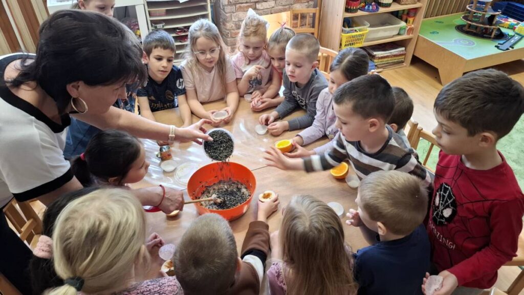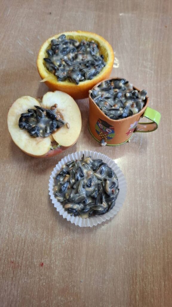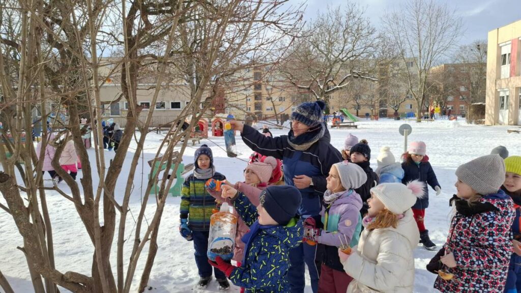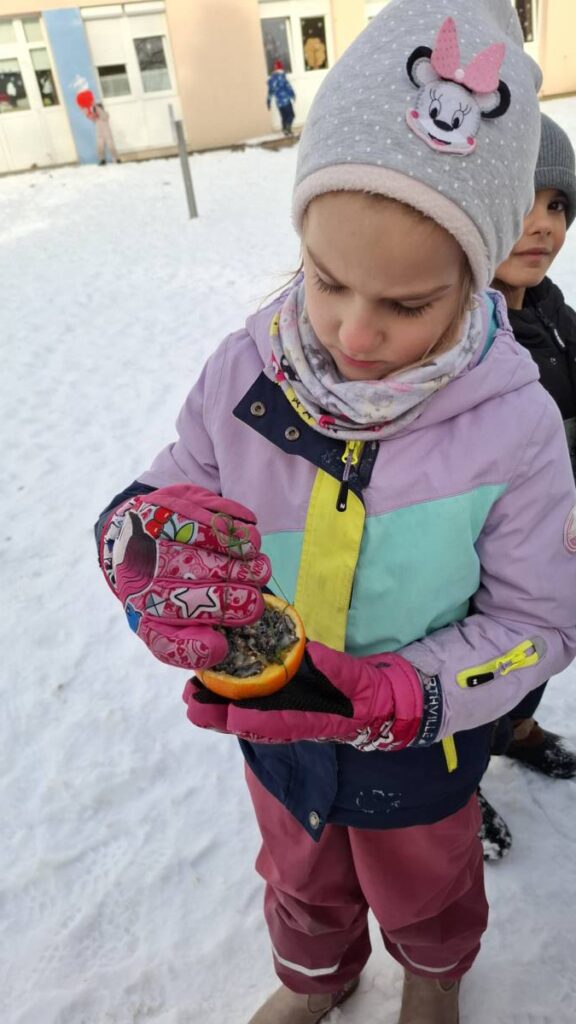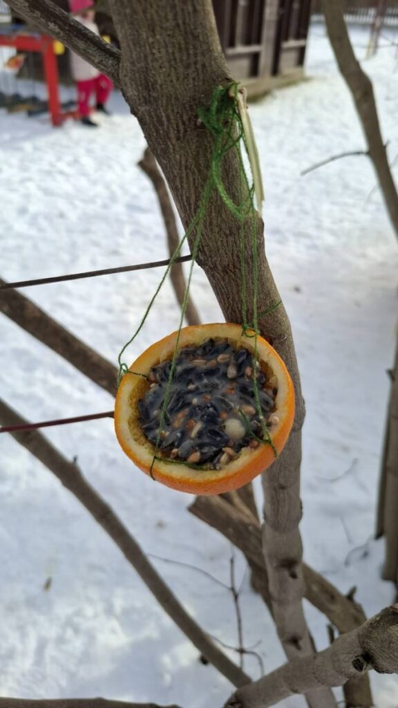 A Misi mókus csoportban gondosan készültünk az itthon maradt madárkák megsegítésére ebben a dermesztő hidegben. Különféle magvakat zsírral összekevertünk, majd különböző formákba adagoltuk. Az elkészült finomságokat a csoportszoba előtti fa ágaira akasztottuk fel, hogy téli időben is legyen mit csipegetniük a madárvendégeinknek.