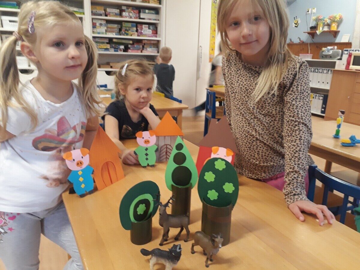 Igyekeztünk egész héten állatokról szóló mesékkel, énekekkel, történetekkel foglalkozni. Így került sor a „Három kismalac és a farkas” című mese megismertetésére. Általunk készített síkbábokkal keltettük fel az érdeklődésüket a mese feldolgozására. Lehetőségük nyílt a meseszereplők „bőrébe bújni” s azok hangján megszólalni. Azóta is napi szinten előkerül a mese, már önállóan is el tudják dramatizálni.